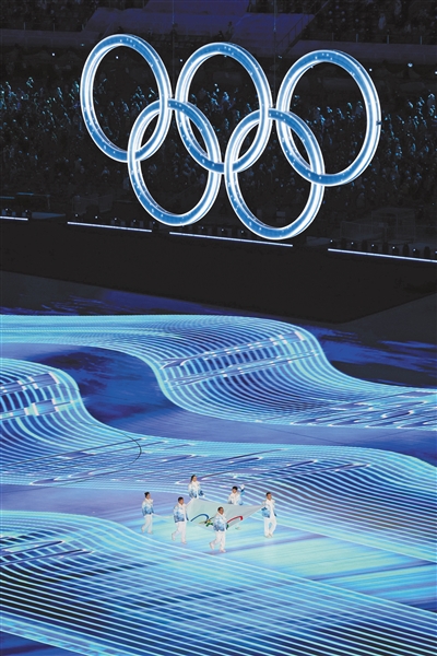 此时,6名冰球运发动泛起在园地中,他们击打着“影像冰球”,不绝撞向这块巨大的“冰立方”。冰屑滔滔散落,晶莹的冰雪五环破冰而出。这是属于奥林匹克的时刻,这是以奥运精神将世界团结在一起的时刻。