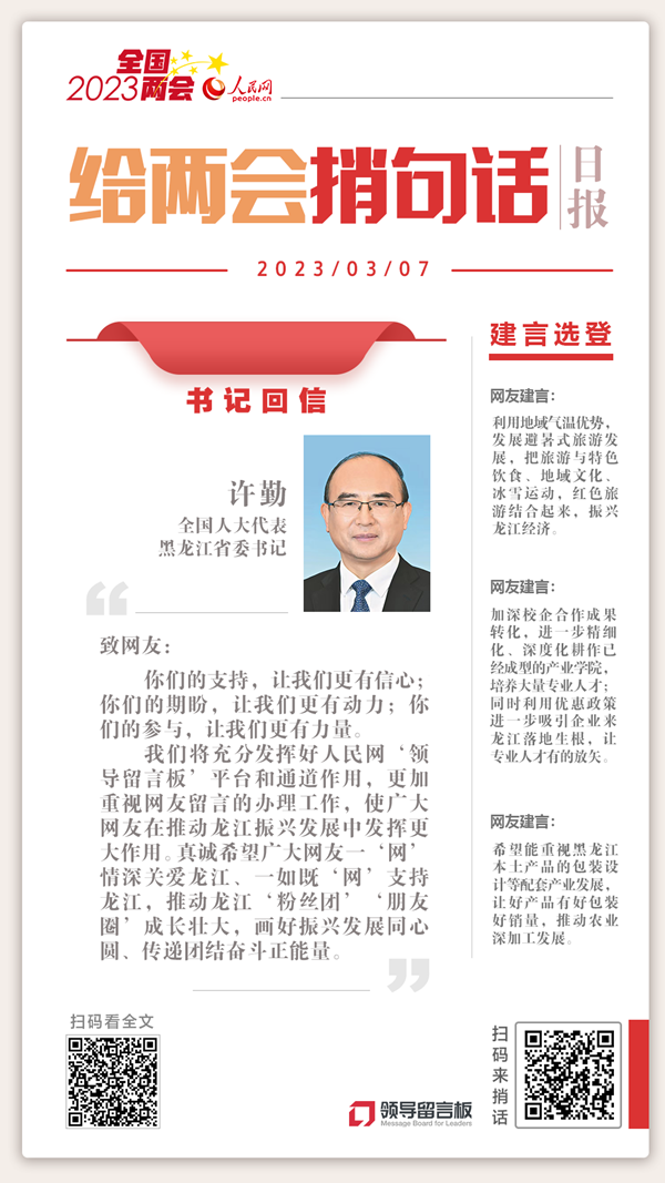 ÈËÃñÍø2023Äê¶È¡°ÎÒ¸øÁ½»áÉӾ仰¡±½¨ÑÔÕ÷¼¯Ô˶¯ÕýÔÚ½øÐУ¬¿í´óÍøÓѹØ×¢²¢»ý¼«¼ÓÈë¡£½üÈÕ£¬ºÚÁú½Ê¡Î¯Êé¼ÇÐíÇÚͨ¹ýÈËÃñÍøÖÂÐÅÍøÓÑ£¬»ØÓ¦ÈºÖÚ¹ØÇС£