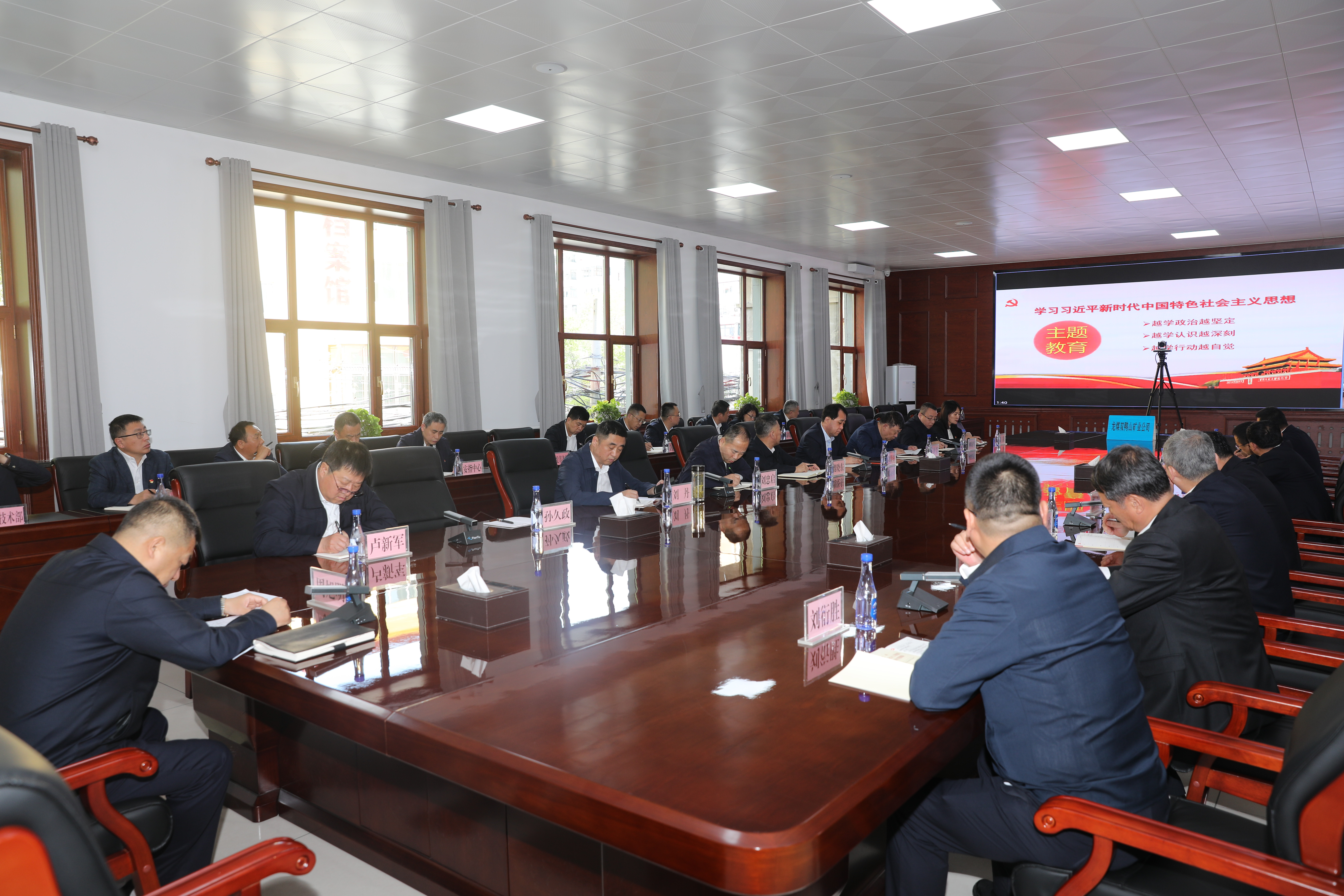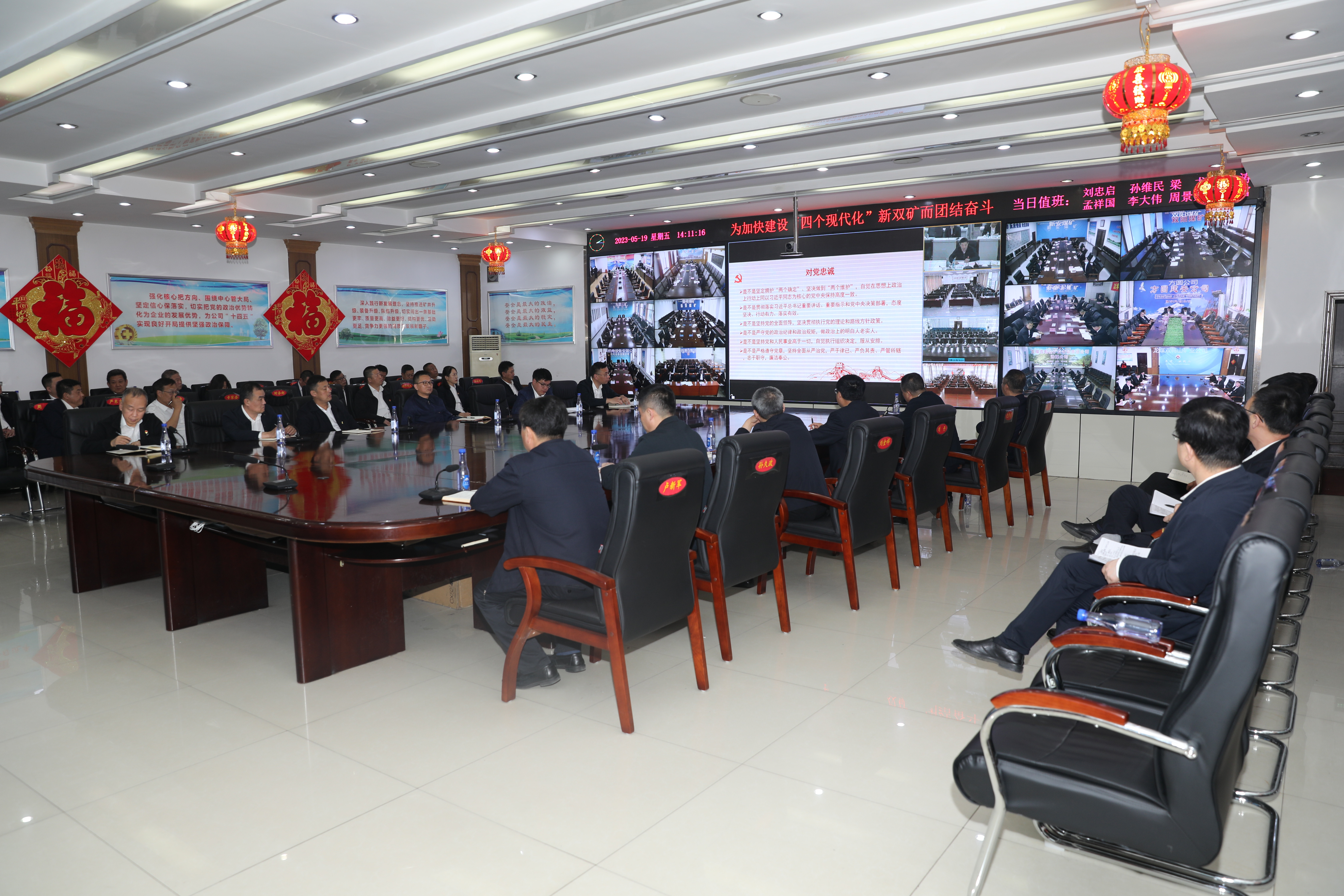 双鸭山矿业公司领导周旭明、卢新军、刘衍胜、孙久政、李春、刘丹、莫永杰、刘忠启、张广、魏晓东 ,公司副总师 ,公司机关及各单位中级副职以上治理人员划分在公司和各单位分会场加入集会。