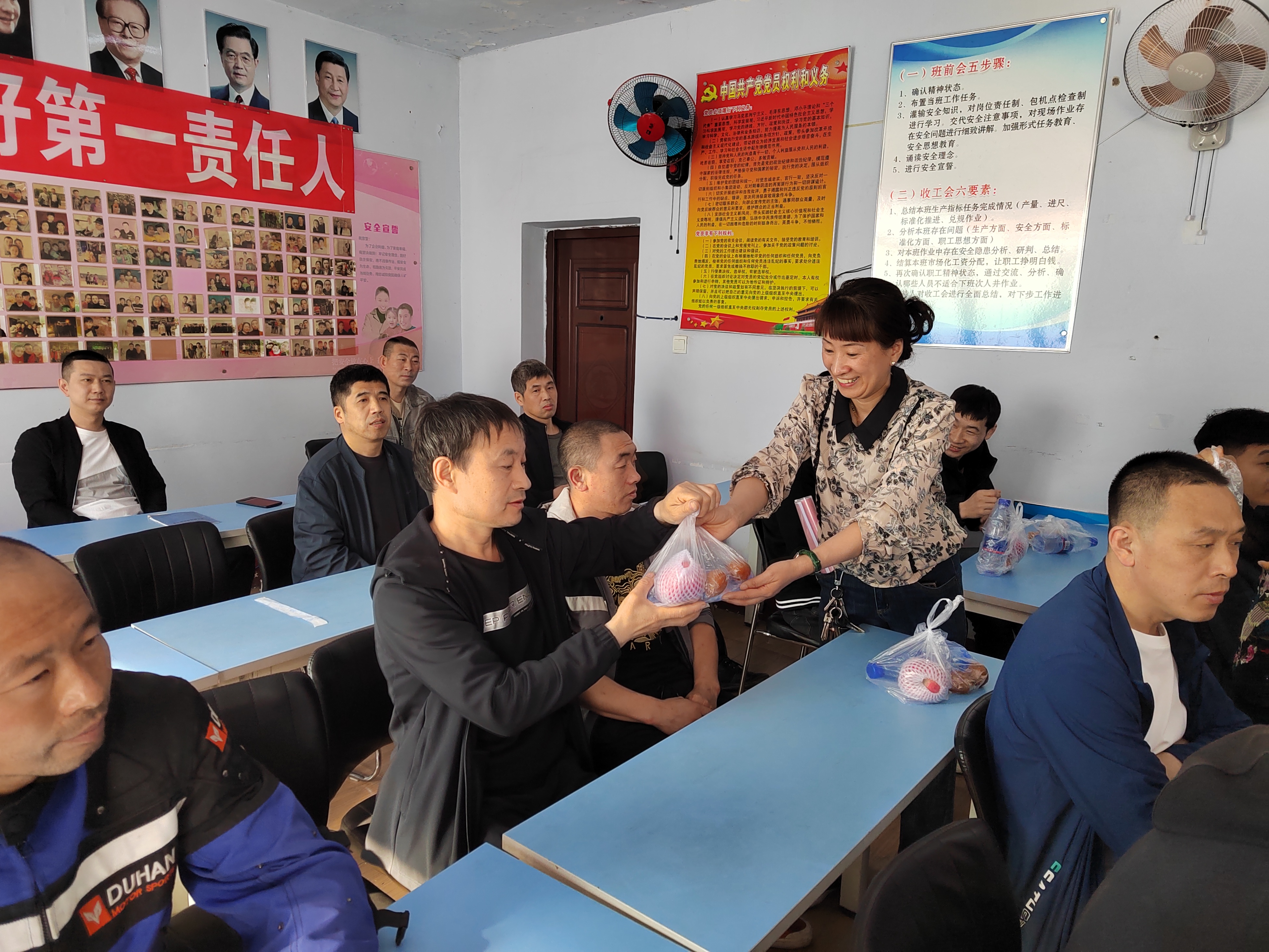 “师傅,来,吃个苹果,井下作业一定注意宁静,按章操作要牢记……”这是5月10日在东荣二矿入井口,该矿金牌家属正在将象征平平安安的苹果送给入井职工的一个缩影。